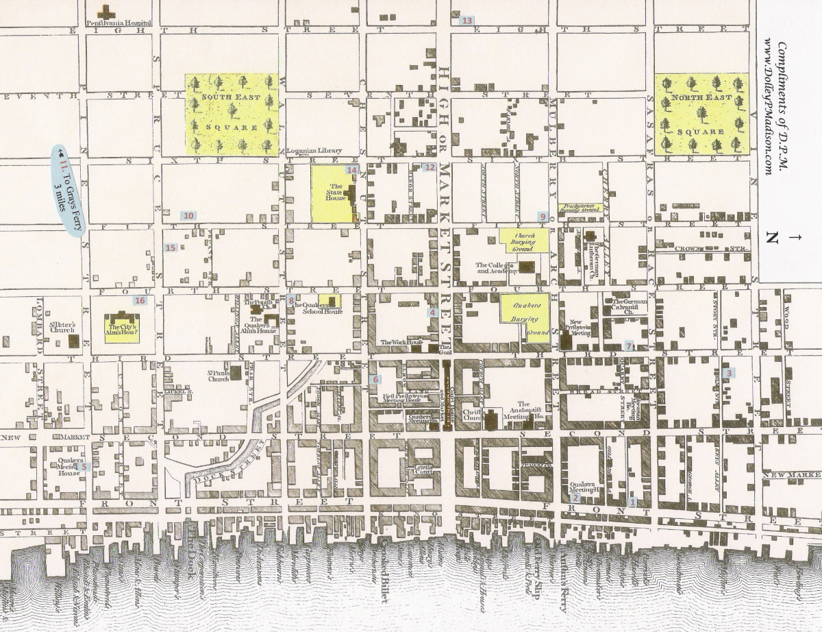 Since most of the street names in the historic district of Philadelphia have remained the same, this map can be used to take a Dolley Madison walking tour of the city. To download a PDF file of the map, click here. To download a key to the map in Word format, click here. Below are listed the Dolley Madison highlights of Philadelphia, in chronological order.