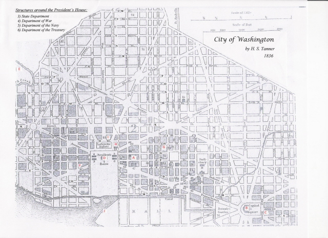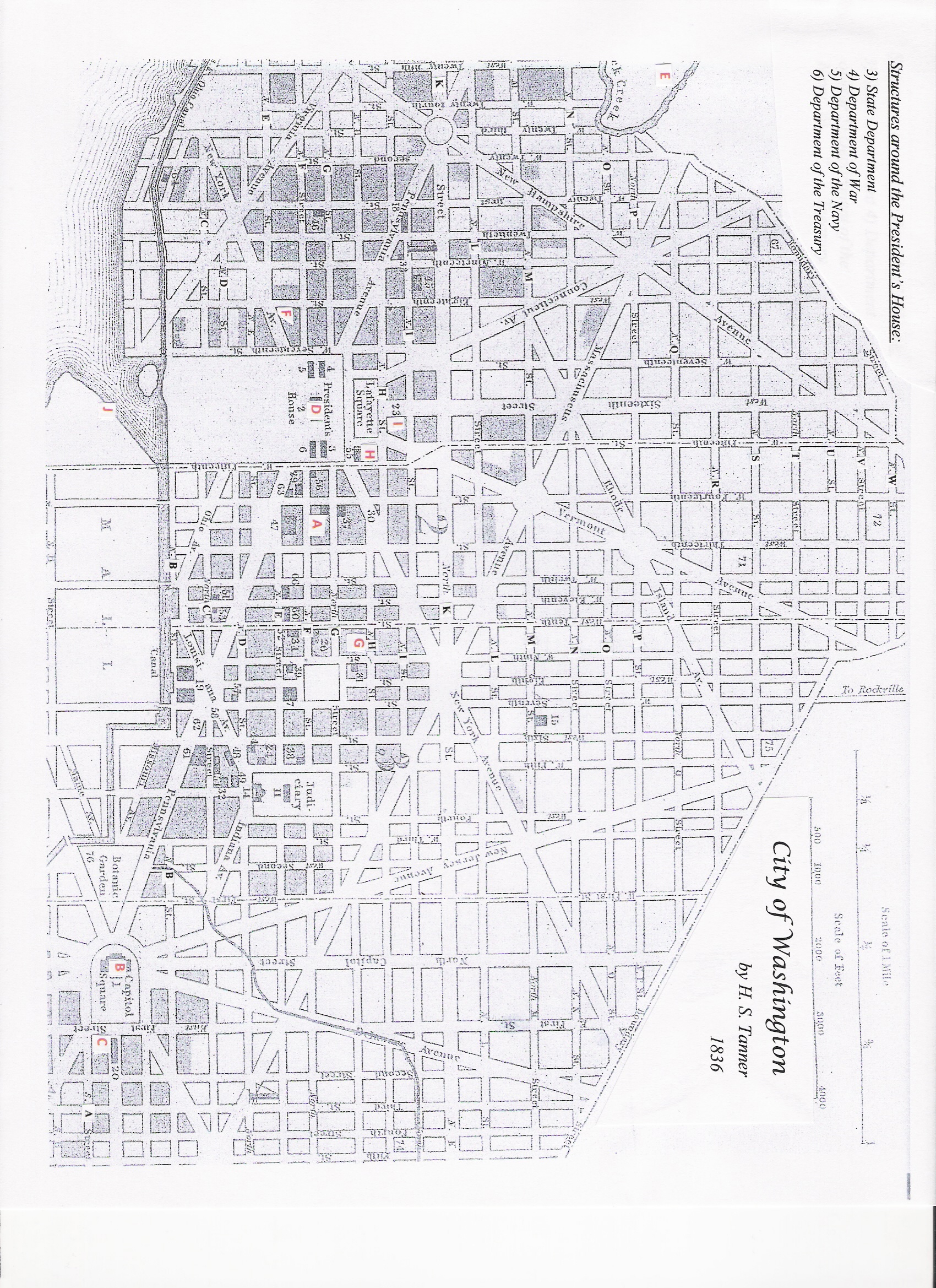 Dolley Madison would live approximately 25 of the next 49 years in the burgeoning Washington City, making her presence felt at, if not actively making her mark on, numerous historical sites. Glimpses of what Dolley saw then can still be seen today. Below is an 1836 map of Washington City (right-click here to download it as a JPEG file).
