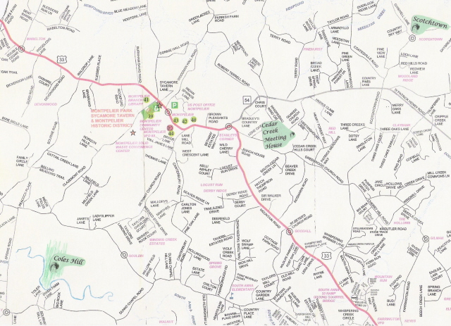 Coles Hill was about six miles from the Cedar Creek Meeting House, the focal point for Quakers in this part of the County. There, John and Mary Payne both served as clerks and elders of the local congregation. According to some accounts, Dolley received at least part of her education at Cedar Creek as well (which would have meant a six-mile trek each way to school). Whether or not that account is true, the Paynes were on the subscribers' list for the school there. Accounts about her early schooling are few and unreliable, but she surely received at least a rudimentary education somewhere -- even if it was at home -- and at some point even acquired a little French. Even if Dolley never went to school at the Cedar Creek Meeting House, it certainly would have been an important center in the lives of this devout Quaker family until they moved away in 1783.
