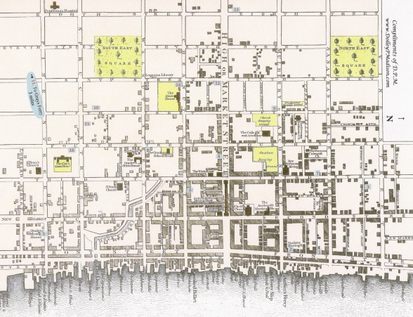 This 1776 map of Philadelphia shows the city largely as it would have appeared to the fifteen-year-old girl who burst onto the scene only a few years later. It is numbered to show the places that would have been meaningful to her during her time in the city.