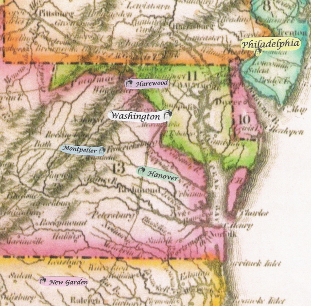 Dolley Madison's world was small, geographically -- she inhabited only a few places in her lifetime -- but her influence has loomed large in almost every place she dwelt. She was born in New Garden, North Carolina, but her parents moved back to their family home in Virginia when she was still an infant. Her childhood was experienced entirely in rural Hanover County, Virginia. From there, Dolley's father moved his family to Philadelphia when she was fifteen. It was in this sophisticated city that Dolley grew to womanhood, married her first husband, became widowed, and met her second husband, James Madison. They would wed at her sister's home, Harewood, in what is now West Virginia, then move back to Philadelphia for the first three years of their marriage. When the nation's capital moved to Washington City, one of the nation's leading political couples, James and Dolley Madison, would soon follow. It was in that bustling and burgeoning setting that Dolley Madison came into her own as the nation's first First Lady. She would later return to the city as a widow after James Madison's death. In the years between his presidency and his death, however, the Madisons would live out their retirement years at his family estate, Montpelier, in Orange County, Virginia. These few places -- New Garden, North Carolina; Hanover County and Orange County, Virginia; Philadelphia; Harewood, in what is now West Virginia; and Washington City -- comprise the key sites of Dolley Madison's world.
