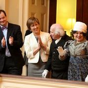 Mr. and Mrs. Madison paid a call on Virginia's General Assembly in Richmond. The occasion of the trip was the 200th anniversary of James Madison's second inauguration as President of the United States, and while there we took the opportunity to introduce the new president of Montpelier, Kat Imhoff. In addition, the Virginia legislature presented us with a resolution commending Montpelier for the fine work it does promoting the legacy of the Madisons, and for educating people about America's constitutional government. |